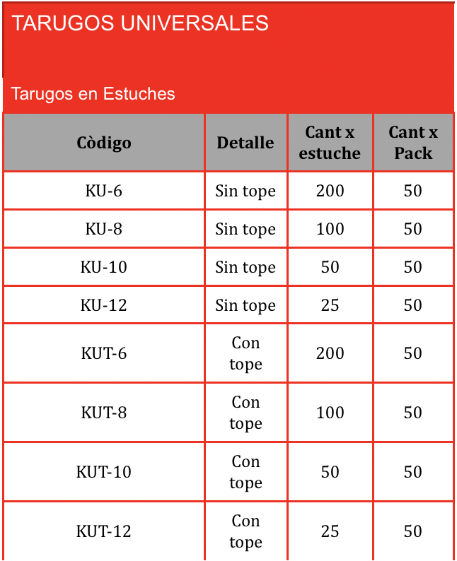 EL UNIVERSAL CUALQUIERA SEA EL TAMAÑO DEL TARUGO, YA QUE TIENE VARIOS CORTES Y CONJUNTAMENTE CON EL MATERIAL ESPECIAL QUE UTILIZAMOS EN LA FABRICACIÓN LOGRAMOS GENERAR UN NUDO CON MAYOR FACILIDAD PARA EL INSTALADOR Y CON UNA MAYOR ADHERENCIA, SUJECIÓN Y FIRMEZA EN PRÁCTICAMENTE CUALQUIER MATERIAL, LLÁMESE CONCRETO, LADRILLO COMÚN, LADRILLO HUECO O HUECO DE HORMIGÓN.